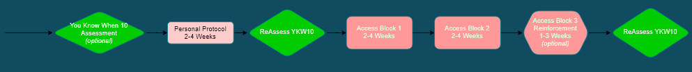 The first and most important thing to do is use the You Know When 10 (YKW10) Assessment to define the roadmap for your training. You will also return to this assessment at the end of each Phase to measure your improved ranges. This Phase also includes Better Breathing Tactics and How To Stack, both of which will serve you long after this Phase. Once you've spent 4 weeks with your Personal Protocol, ACCESS your capacities with Personalized Physical Preparation (PPP) for 4-11 weeks, mixing in any Protocol movements you still need to address your relative biomechanics. This phase is all about giving you the range of motion and breathing tactics you need to move forward in the progression.